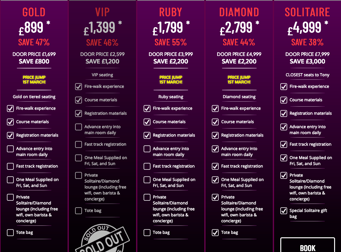 Below is a snapshot of what’s still available right now and for those who may find it a bit pricey – no sweat, all levels of ticket price include a fire-walk experience. See how genius this man is? He can get you to pay thousands to willingly walk over hot coals in his presence. He may not “be your Guru” but maybe he’s actually a bonefide ‘God.’ I’d definitely find the cash if Tony himself starts walking on water though – I’d pay more that eight grand in fact to witness him marching across the atlantic like Poseidon without the aid of his private jet. Thinking about it, I wouldn’t be surprised if he did. He makes our softly spoken UK business legend Richard Branson seem like a whimsical barrow boy character. If you get the chance to witness this unique individual, don’t follow my lead – Unleash the Power Within you – and go.